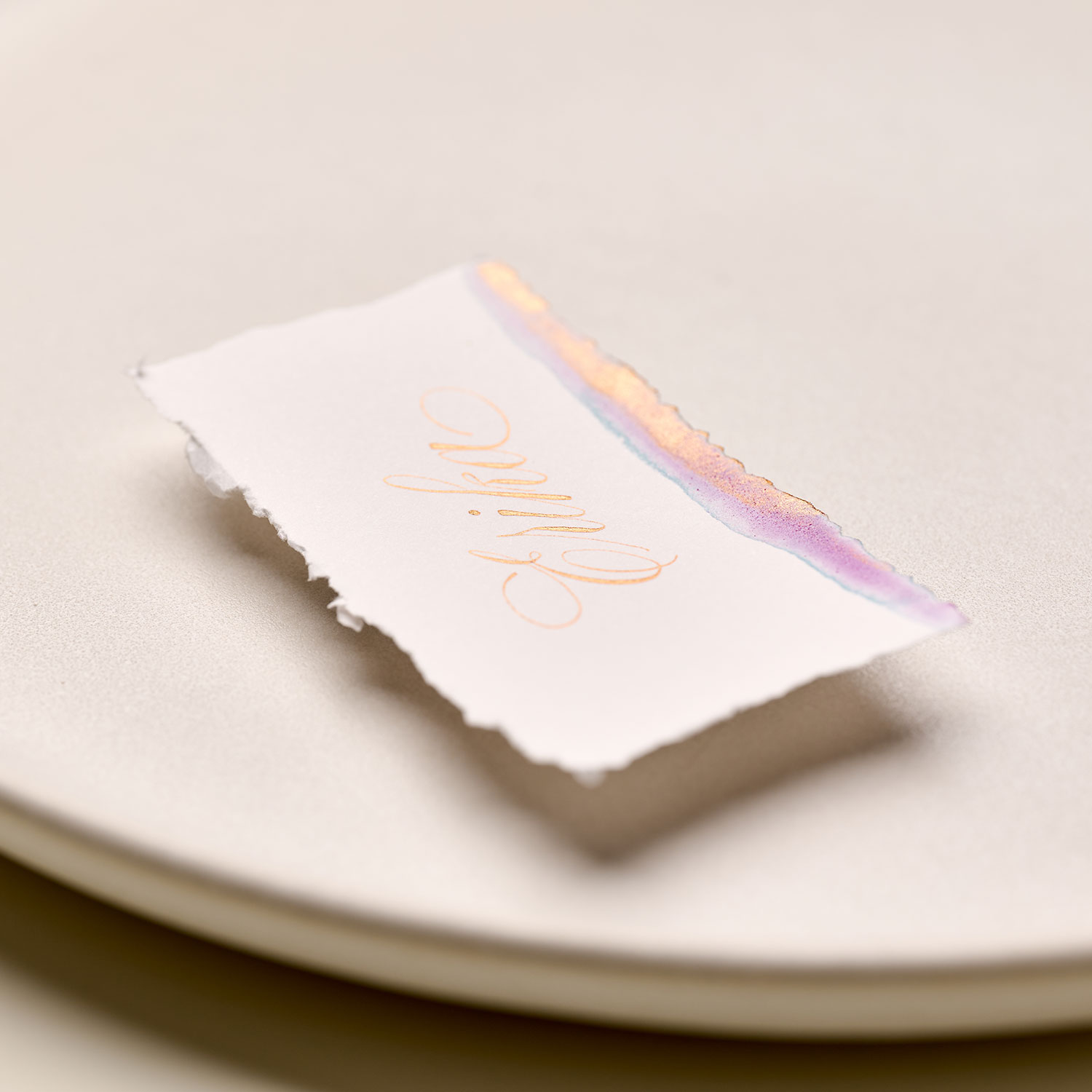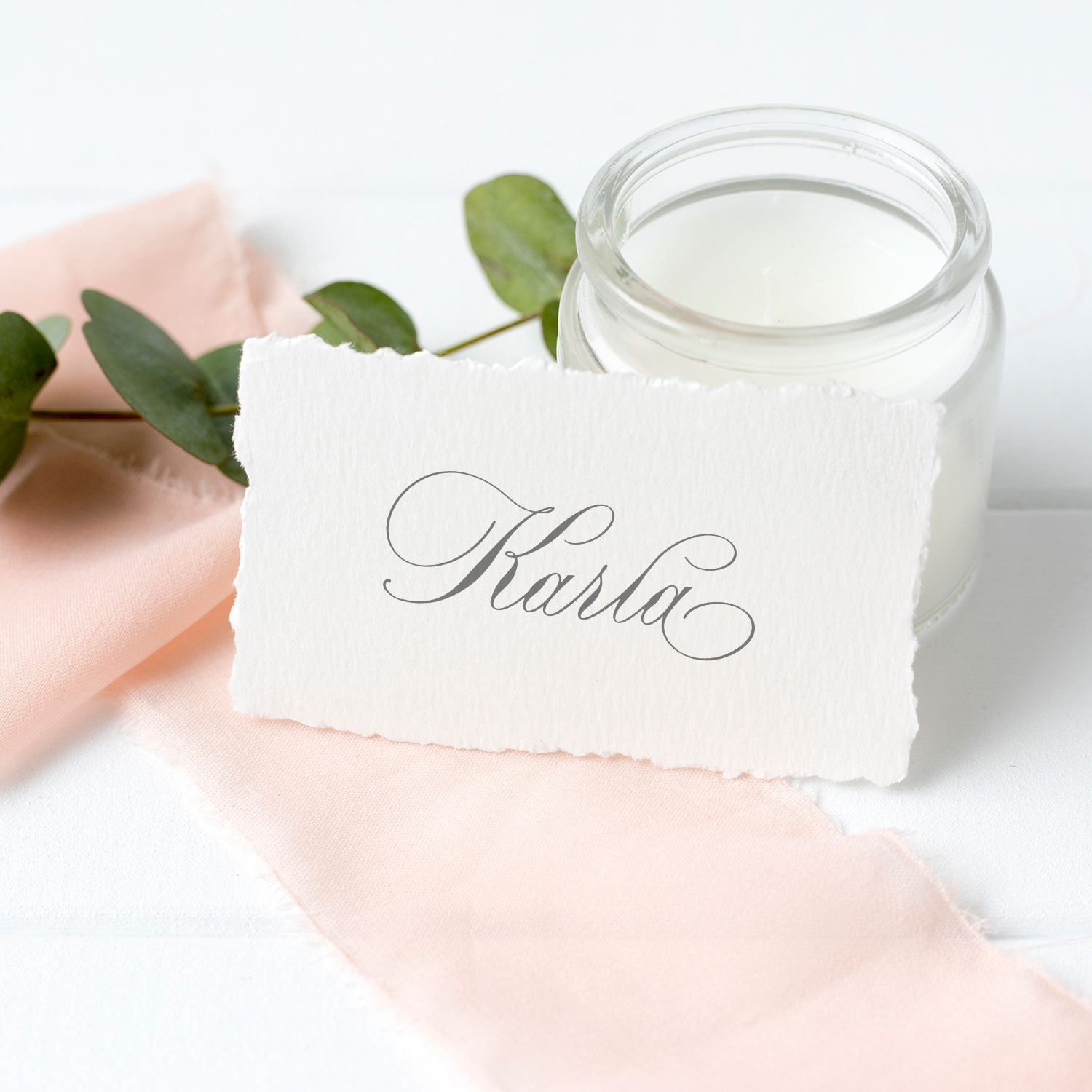 Svojemu najlepšemu dnevu dodajte pridih elegance in prefinjenosti z našimi kaligrafsko napisanimi imenskimi karticami. Napisane so z osupljivo natančno kaligrafijo in so pomemben detajl, ki vašim gostom pomaga najti svoj sedež in vašemu dogodku doda osebno noto.