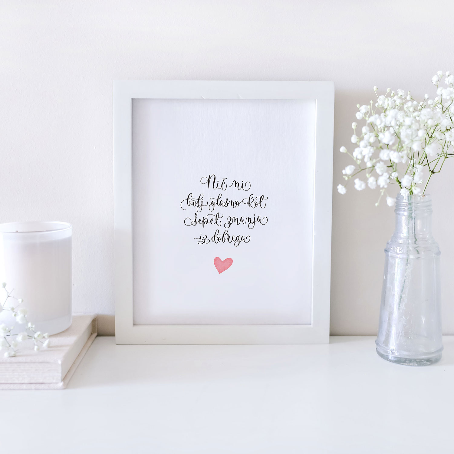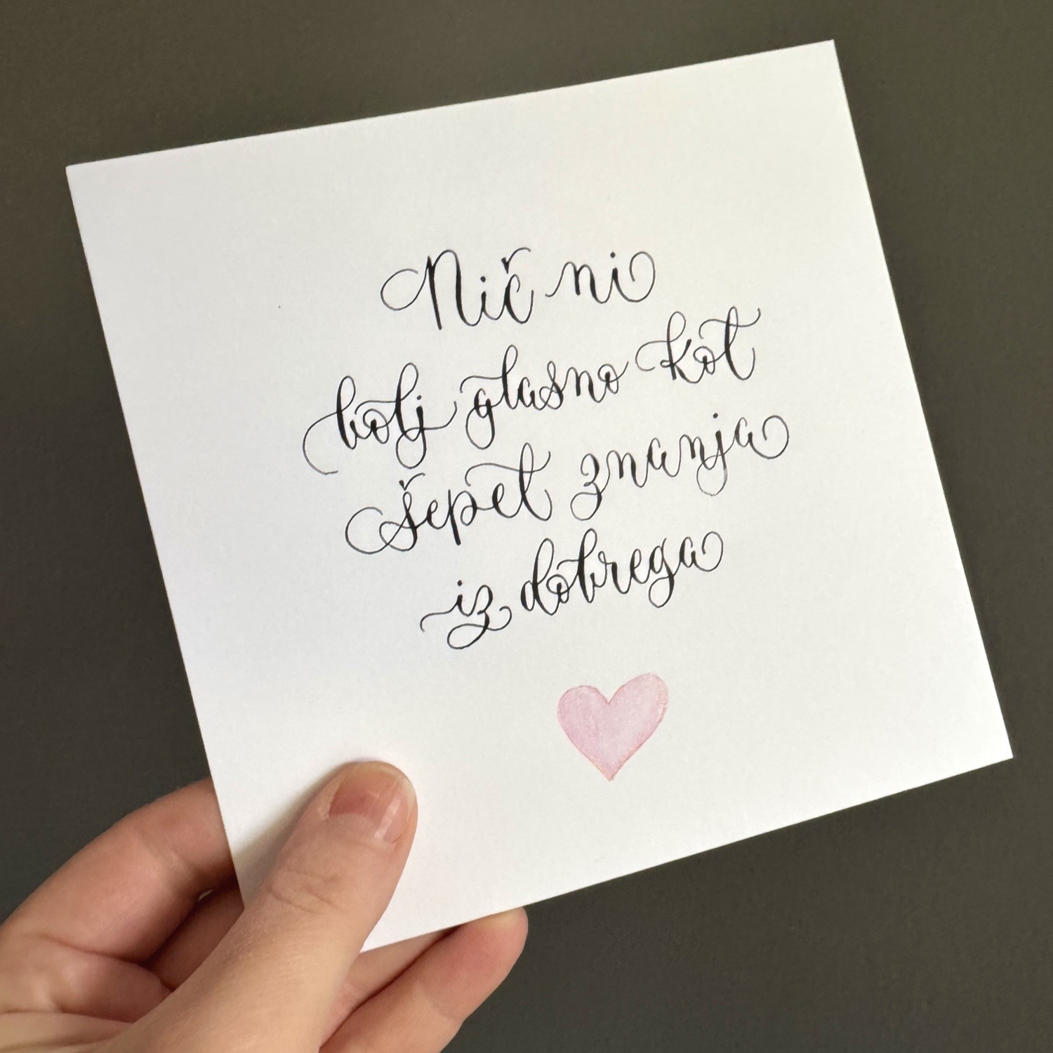 - Originalni kaligrafski citat – napisan ročno in s pozornostjo – v vrednosti 35,00 EUR. To ni tisk, ni kopija. To je unikatna umetnina napisana z moderno kaligrafijo. S pravim črnilom in dušo. Na kvalitetnem kaligrafskem papirju 250 g, dimenzije 15 x 15 cm (okvir ni vključen).