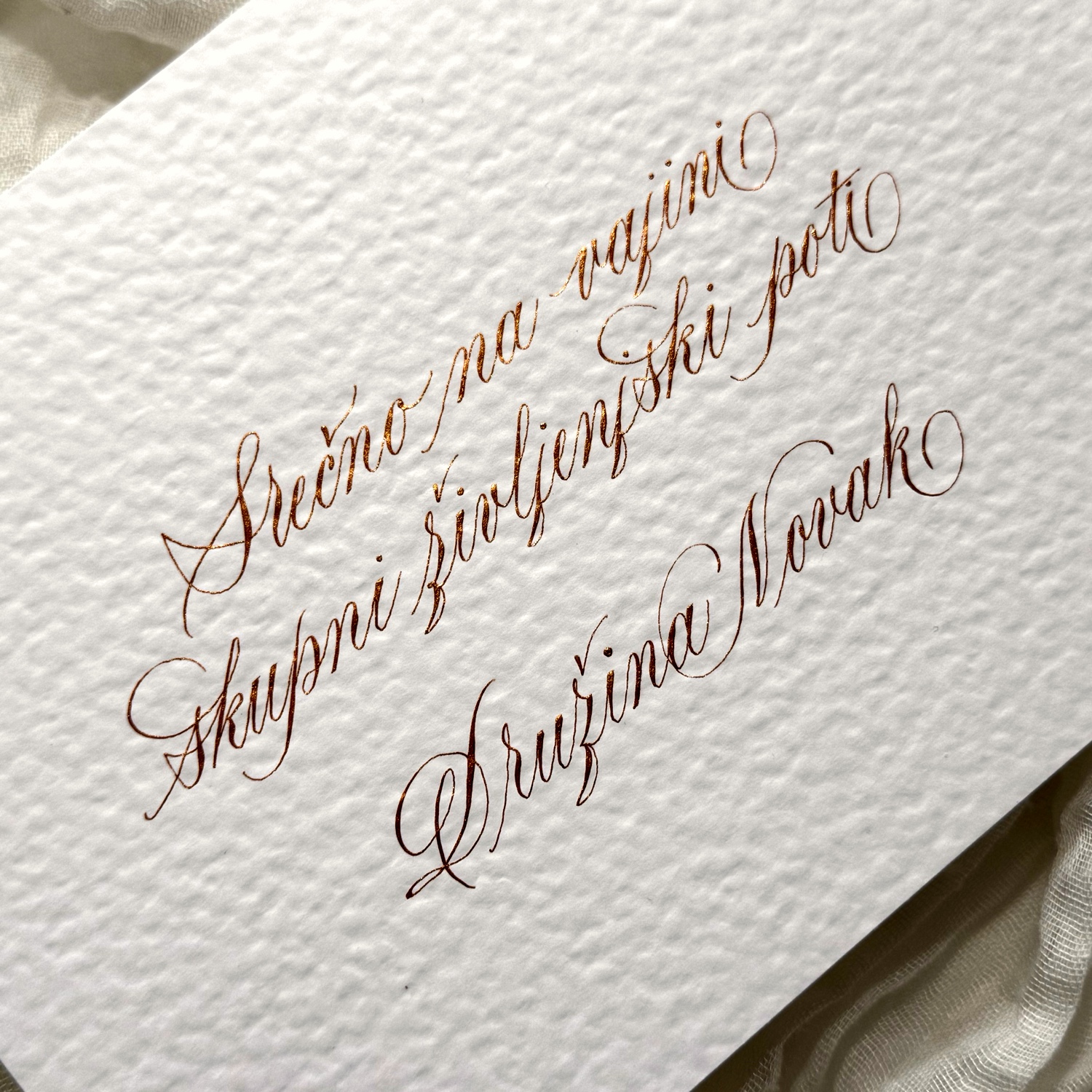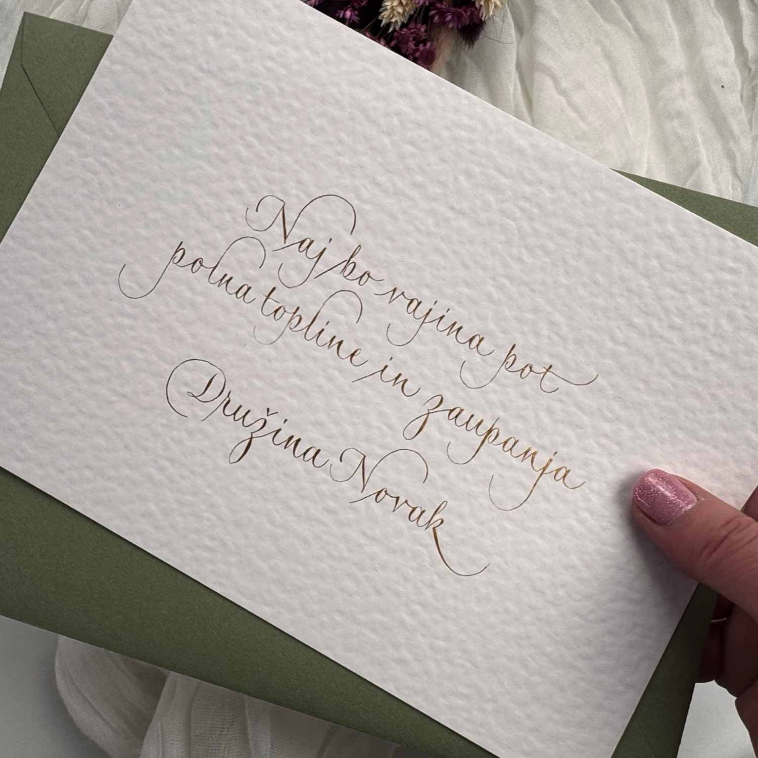 - Kaligrafsko napisano voščilo A5 v kuverti z navedbo tistih, ki voščilo izrekajo.