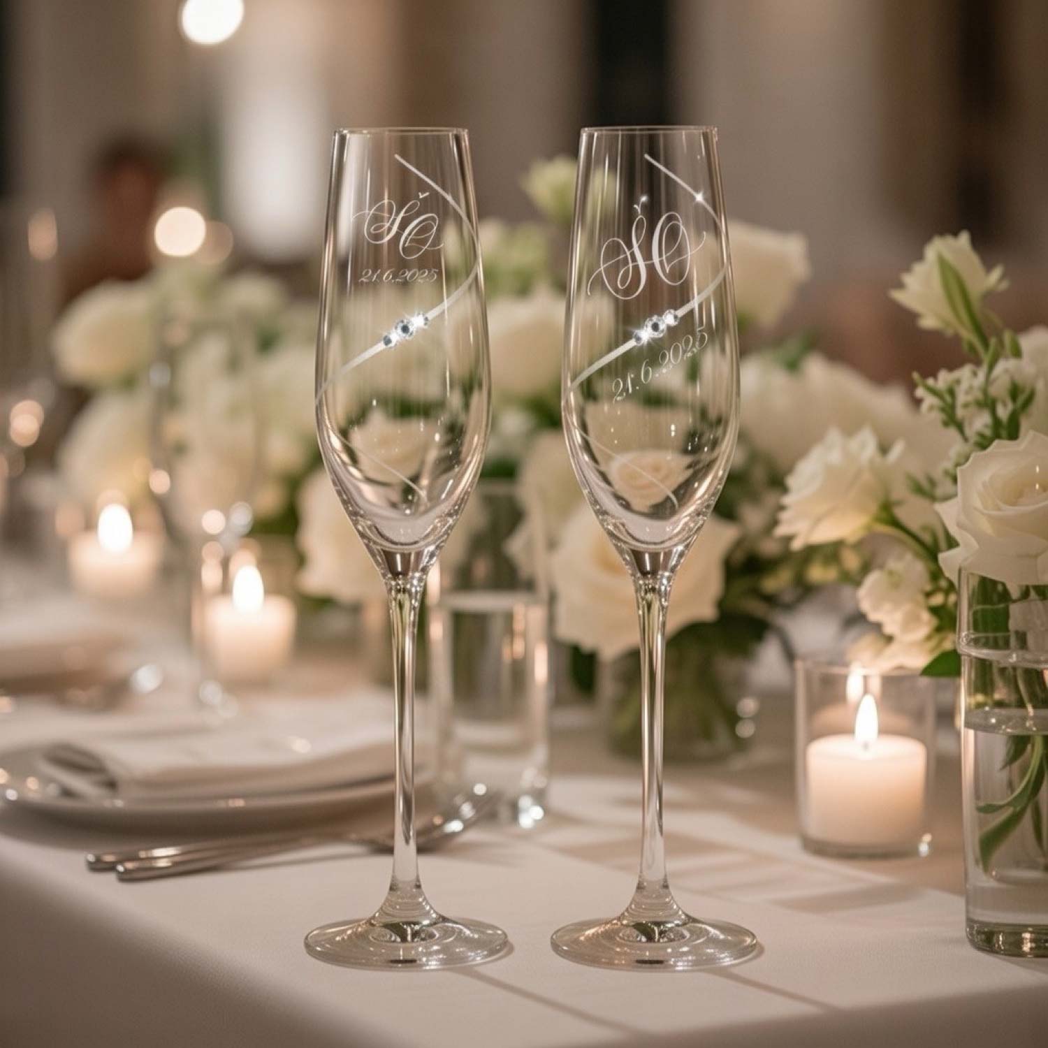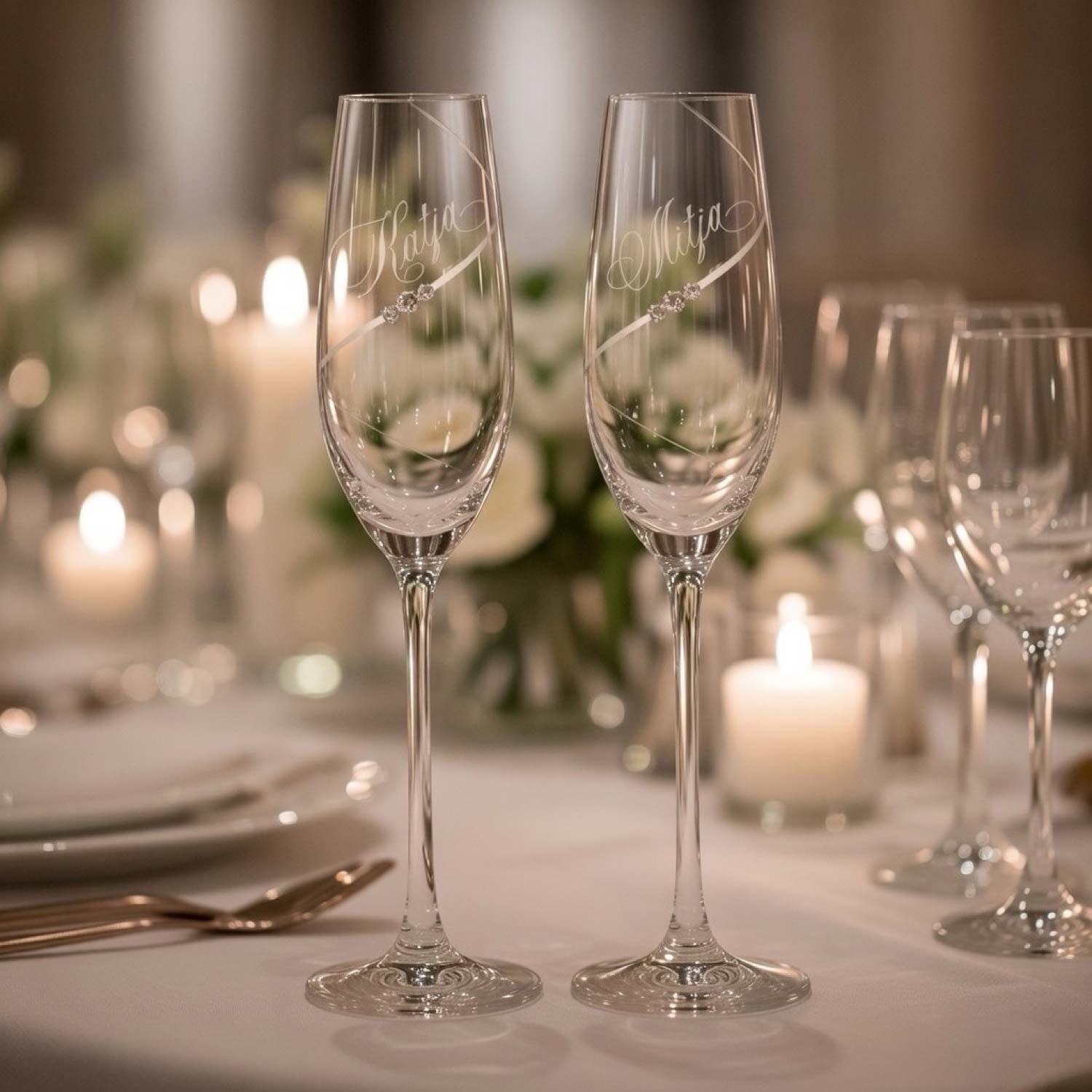Ime je polno gravirano na vsak kozarec s prefinjeno kaligrafijo. Namesto začetnic ali monograma vsak kozarec nosi celotno ime neveste in ženina, kar darilu doda osebno in čustveno vrednost.