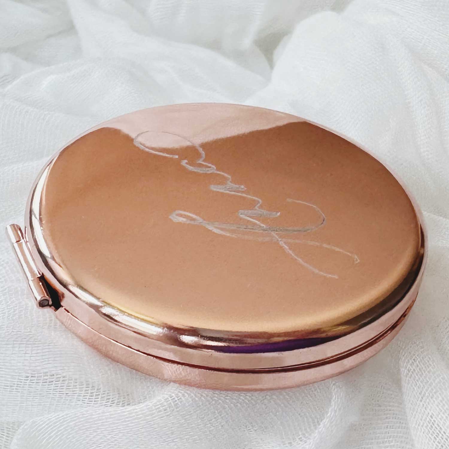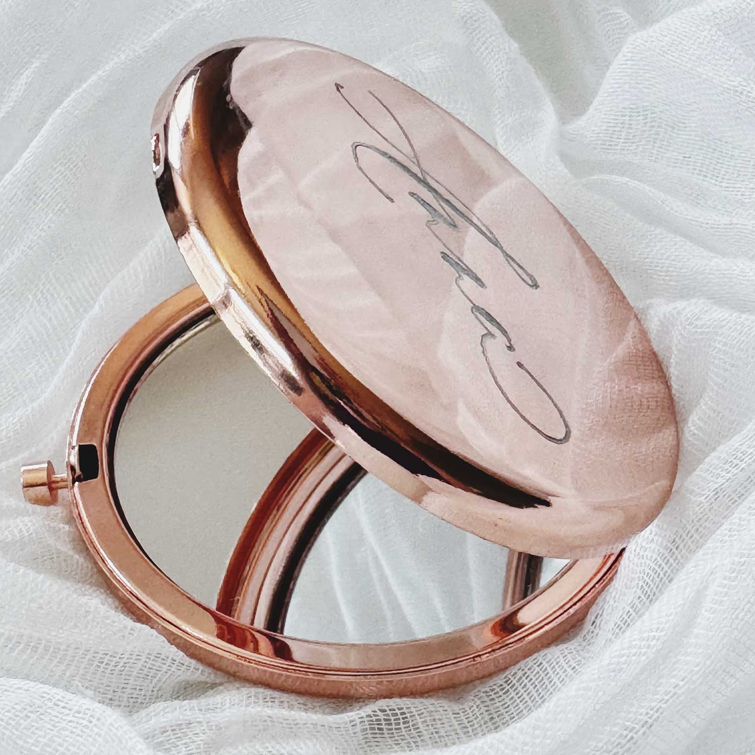 Mini kozmetično ogledalo v kovinsko rožnato zlati barvi je darilo z dušo. Vsak kos ročno graviram z imenom ali kratkim sporočilom. Kaligrafska pisava izdelku doda pridih elegance in unikatnosti.