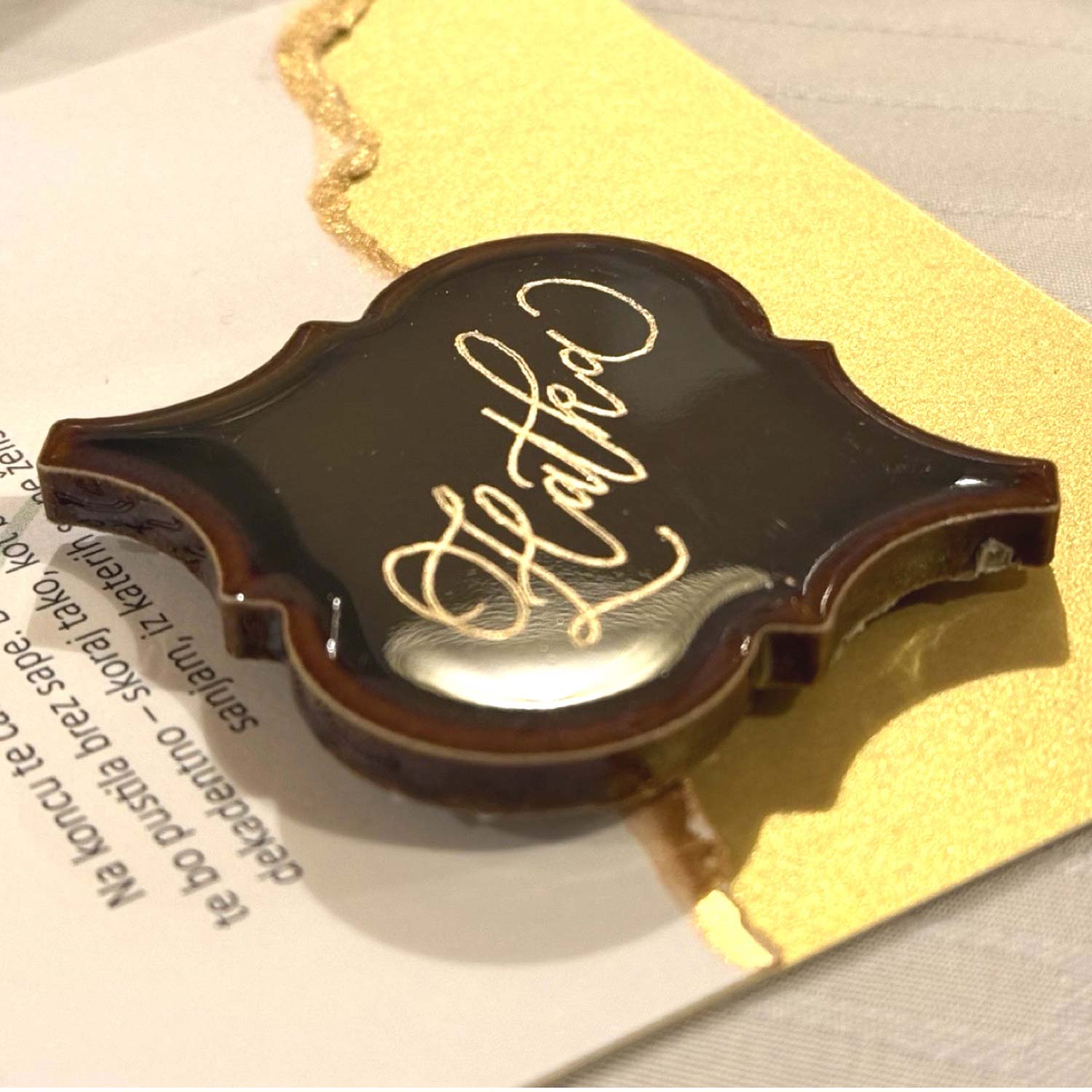 Vsako ime je s pozornostjo ročno gravirano s kaligrafsko pisavo po vaši izbiri. S tem posebnim detajlom ne poskrbite le za organizacijo dogodka, temveč ustvarite občutek prestiža, topline in premišljenosti. Če dodate še magnetno tablo, lahko oblikujete pravcato imenitno razstavo, ki izraža vašo osebnost in spoštovanje do povabljenih.